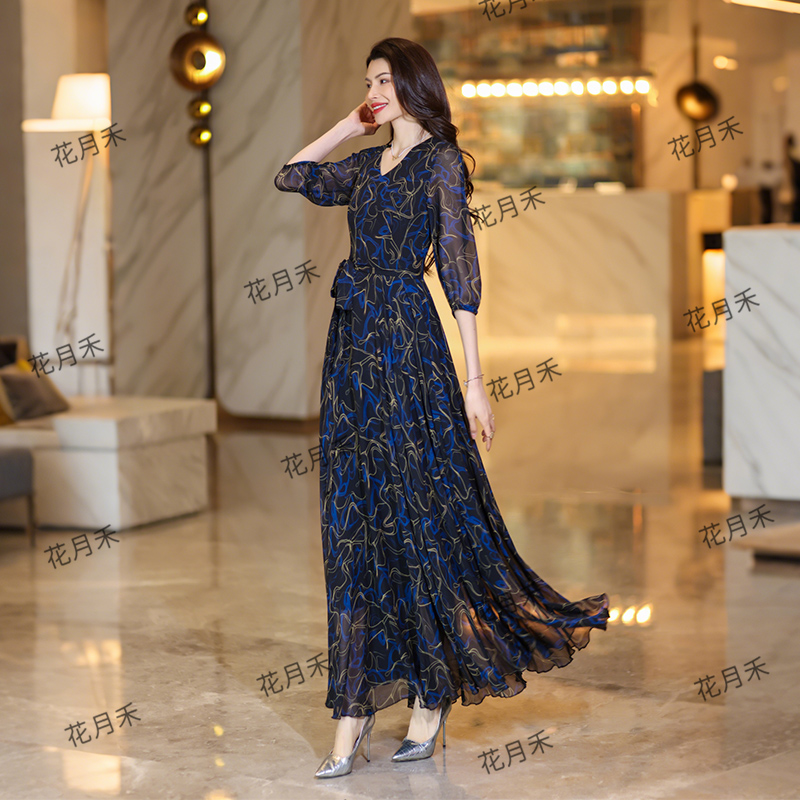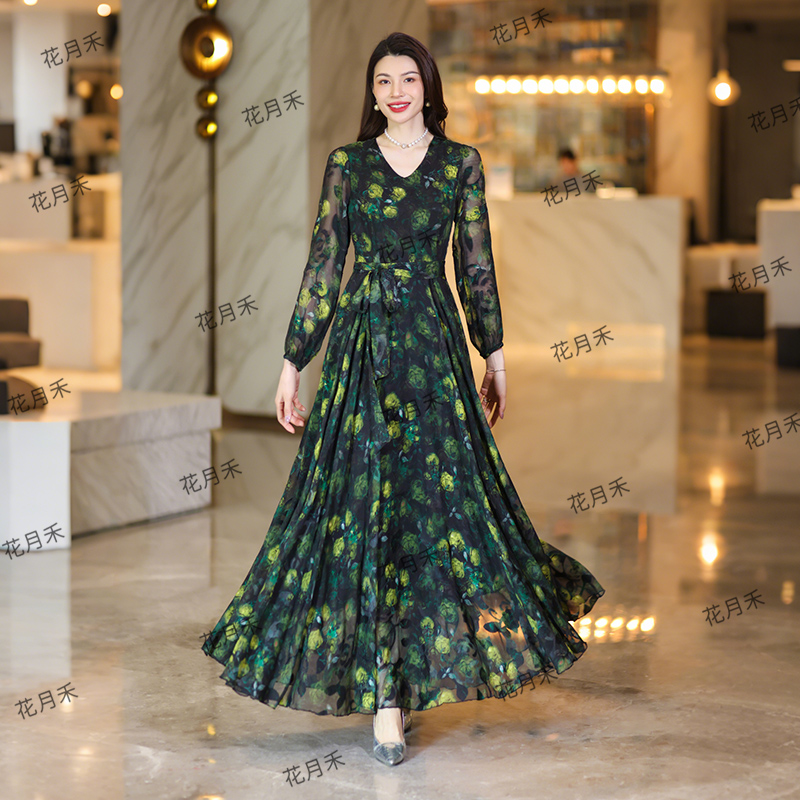 2025年秋冬新款印花连衣裙显瘦旅游度假宴会表演长裙雪纺裙沙滩裙