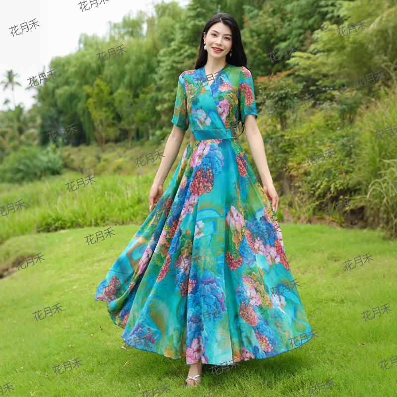 2025年秋冬新款女士大摆V领沙滩裙印花连衣裙收腰显瘦长裙雪纺裙
