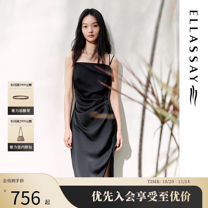 ELLASSAY歌力思秋冬新款钓系垂坠雪纺千金风吊带小黑裙连衣裙女