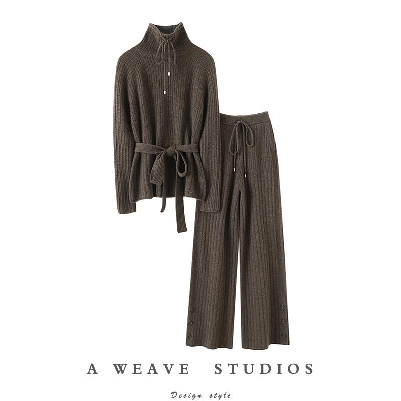 温婉时髦气质!加厚羊绒衫女高领系带针织羊绒阔腿裤子女外穿套装
