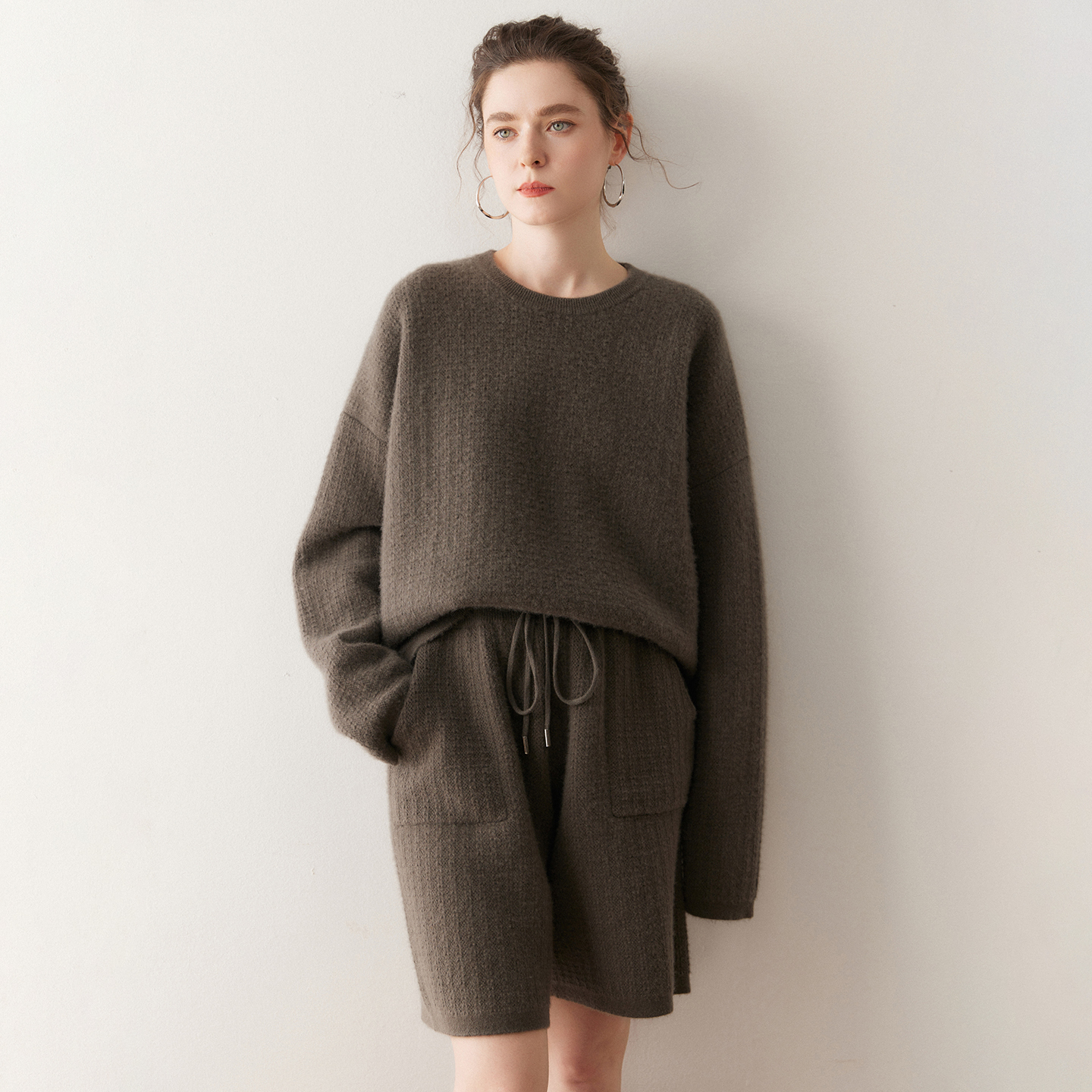 秋冬款100%羊毛衫套装女圆领宽松慵懒风针织羊绒衫上衣短裤两件套
