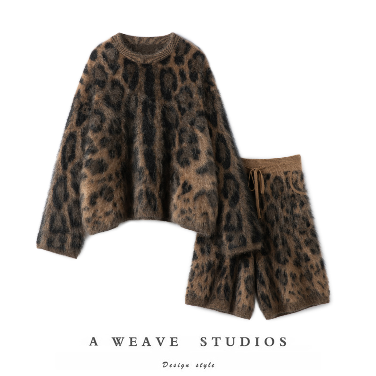 100%山羊绒复古豹纹针织套装宽松软糯毛衣休闲五分裤两件套女秋冬