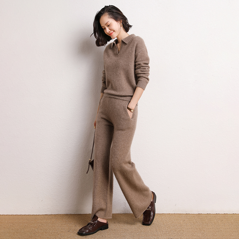 美炸天啊姐妹!加厚100%纯山羊绒衫女圆领针织休闲直筒裤子女套装