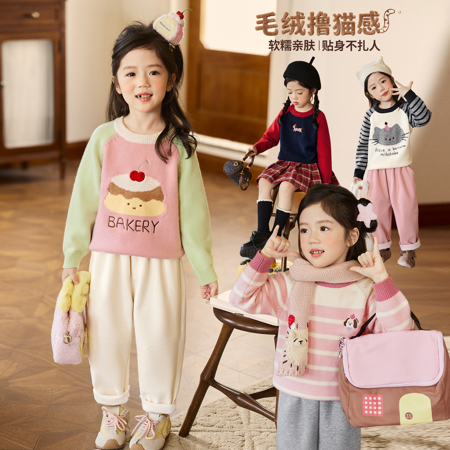 小O宝Okids童装宝宝毛衣女套装插肩袖图案2025冬季新款女童针织衫