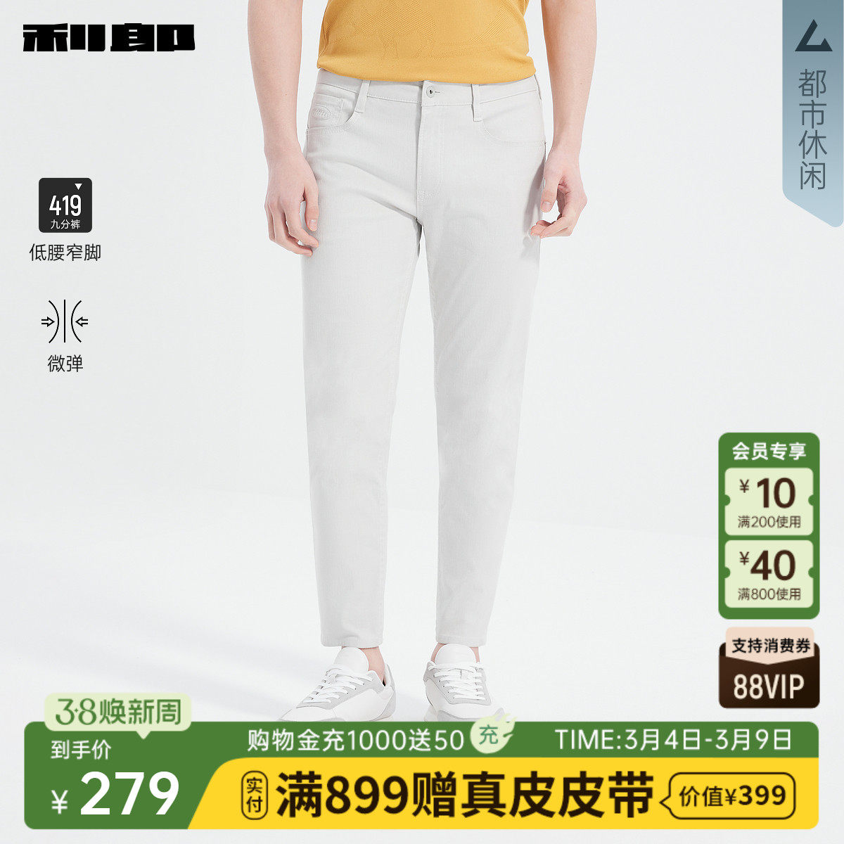 利郎官方 九分牛仔裤男2026春季新款小脚裤弹力刺绣米白色裤子男