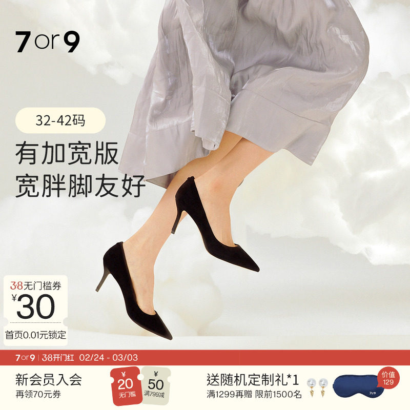 7or9黑色高跟鞋女鞋大码羊皮尖头细跟通勤浅口单鞋不累脚黑松露