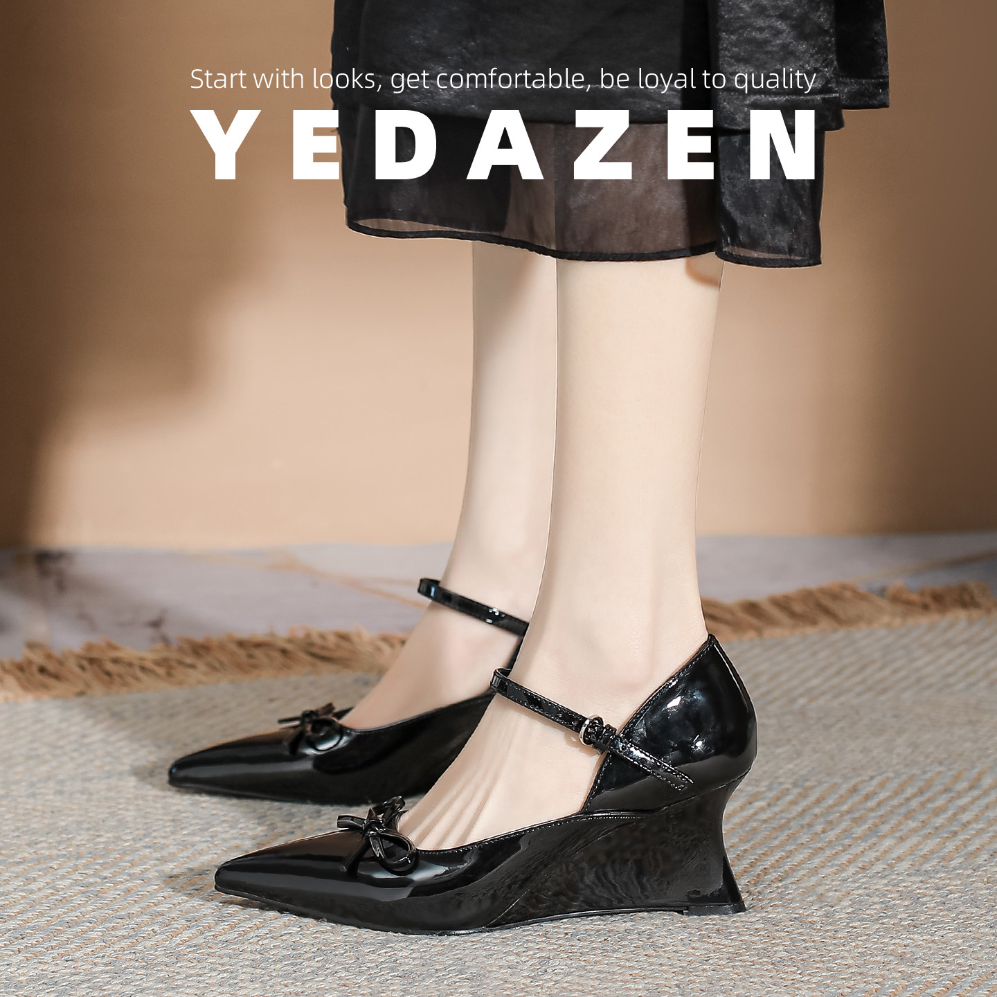 法式黑色玛丽珍鞋女春季坡跟尖头蝴蝶结高跟鞋一字带复古漆皮单鞋