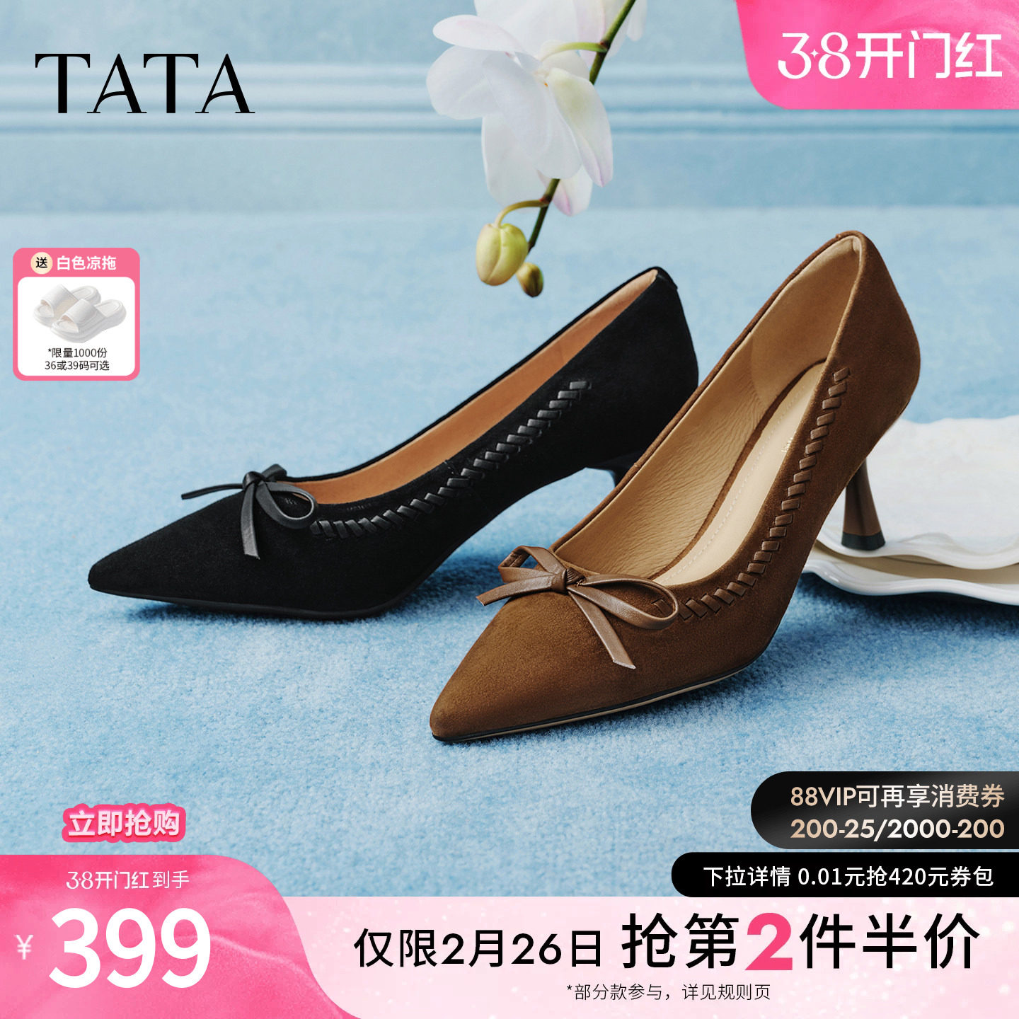 TATA他她雾绒情书尖头高跟鞋女真皮黑色细跟鞋气质单鞋UZG01AQ6