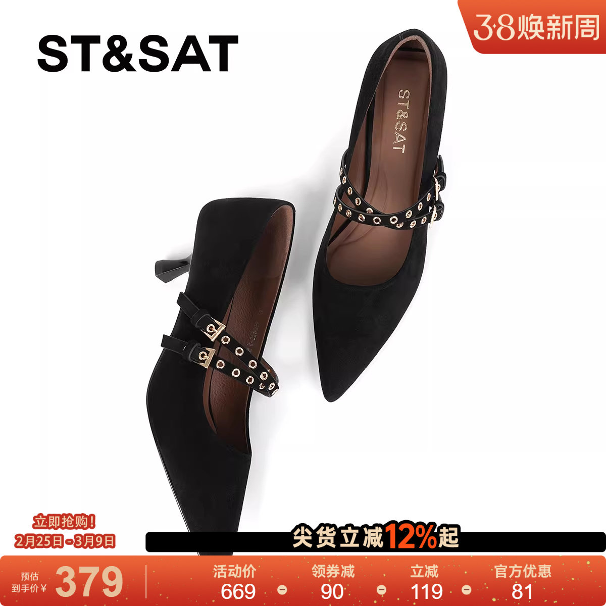 法式尖头铆钉玛丽珍鞋坡跟2026新款一字带黑色高跟单鞋设计感小众