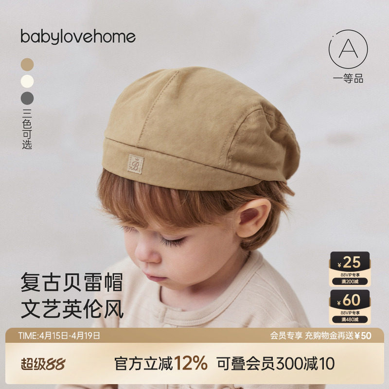 babylove婴幼儿帽子春秋季纯棉时尚宝宝贝雷帽纯色百搭洋气画家帽