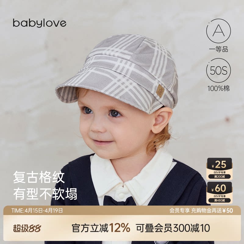 babylove男宝宝帽子春秋季纯棉鸭舌帽英伦风外出贝雷帽格纹软檐帽