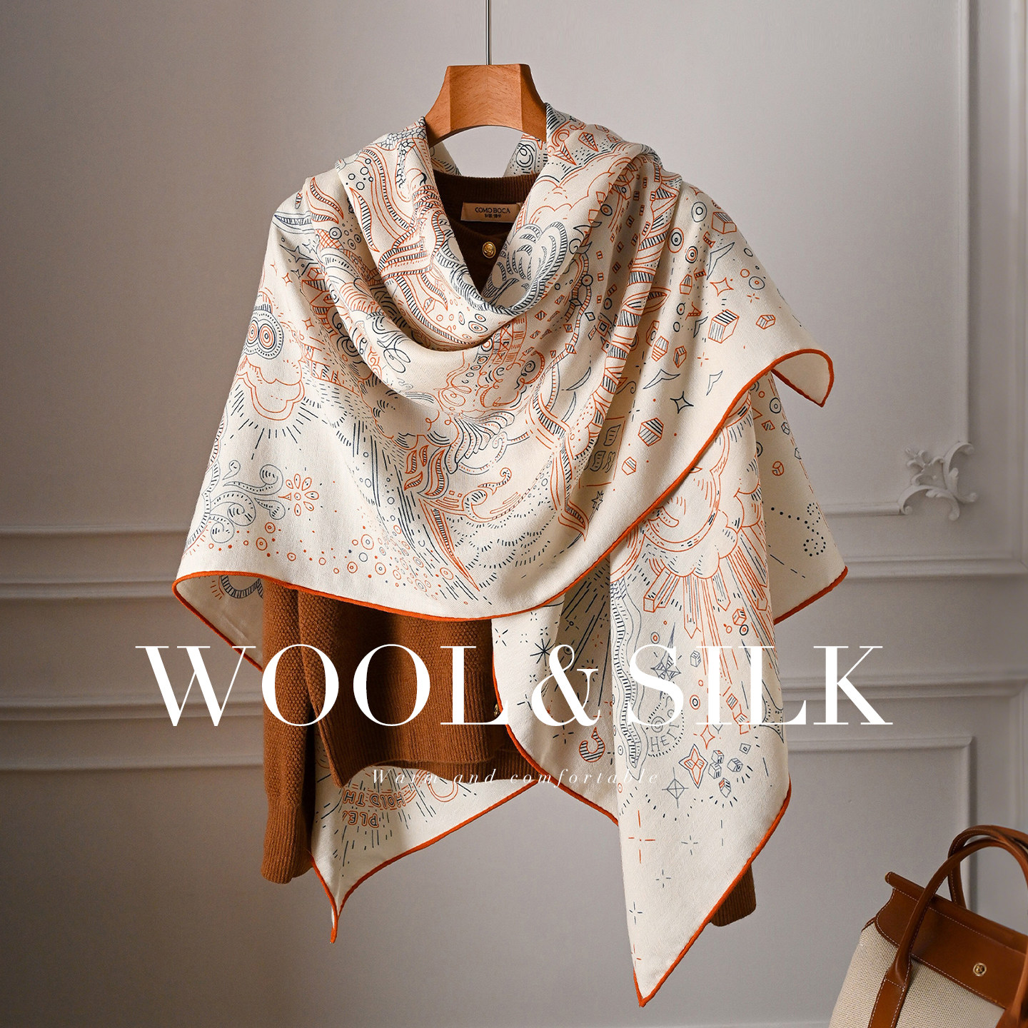 意式氛围!轻奢丝毛围巾女春秋多功能百搭真丝羊毛大方巾披肩两用