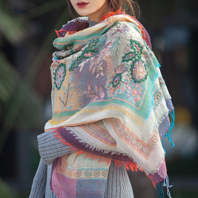 高档手工刺绣钉珠民族风百搭围巾女两用印度进口旅游羊毛披肩外搭