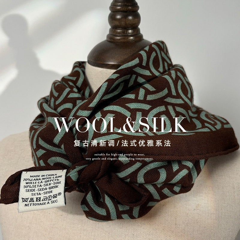 复古棕绿配色!丝毛围巾女冬季知性百搭真丝羊毛方巾披肩围脖两用