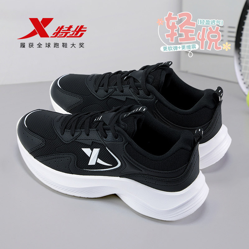 特步女鞋2025新款秋季皮面黑色运动鞋女跑步鞋网面轻便软底老爹鞋