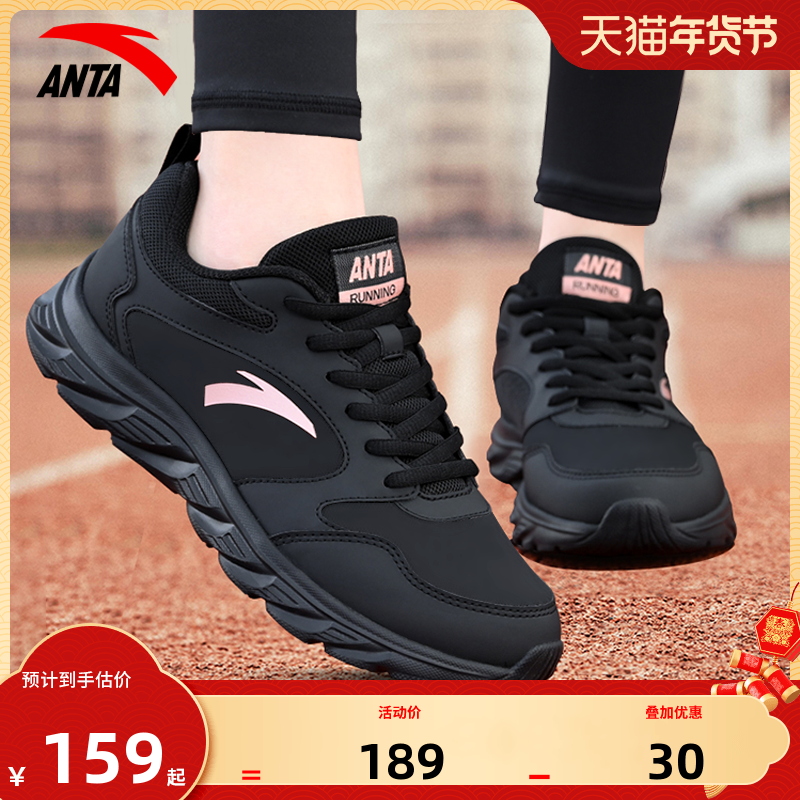 安踏女鞋黑色运动鞋女晴空2026冬季新款皮面防水不累脚软底跑步鞋