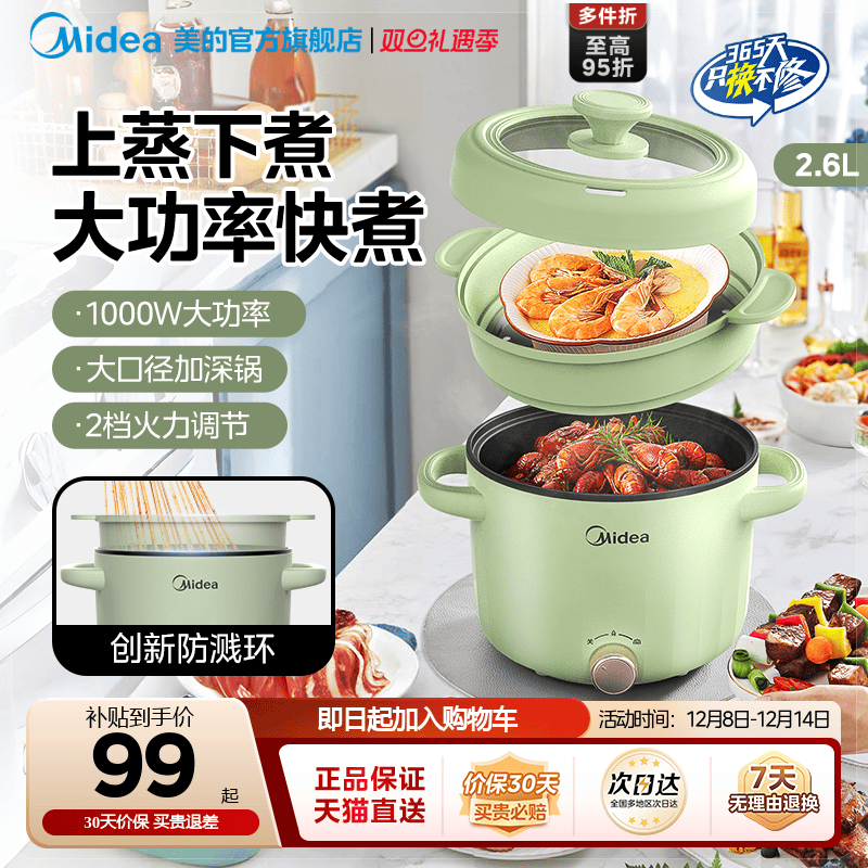 美的电煮锅宿舍学生泡面家用蒸煮一体锅多功能小型迷你火锅烹饪机