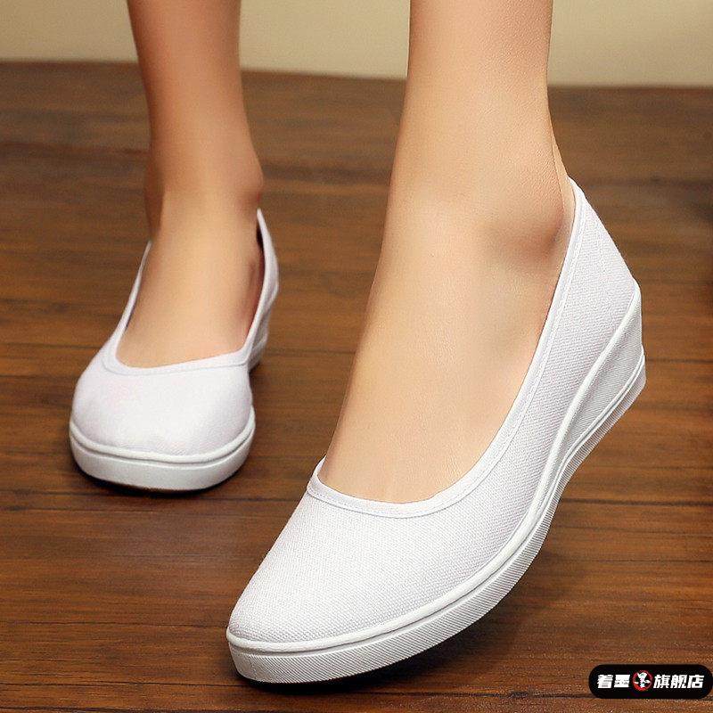 正品老北京布鞋女鞋一字护士鞋白色坡跟上班工作美容鞋透气小白鞋