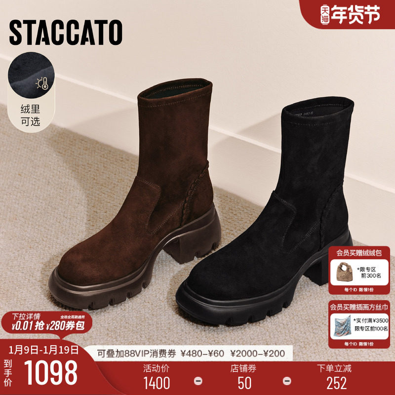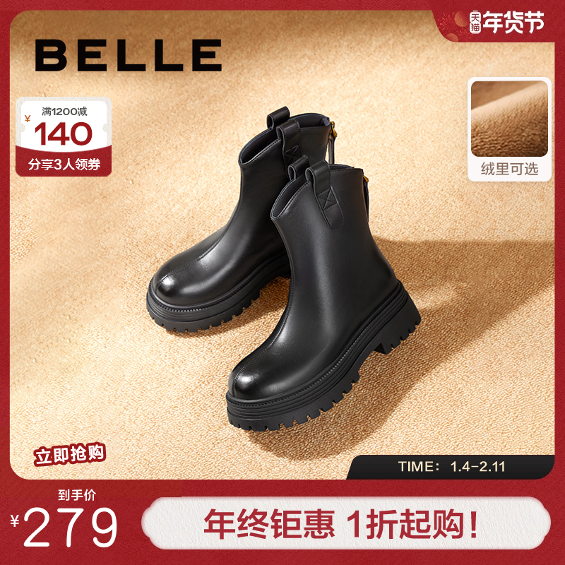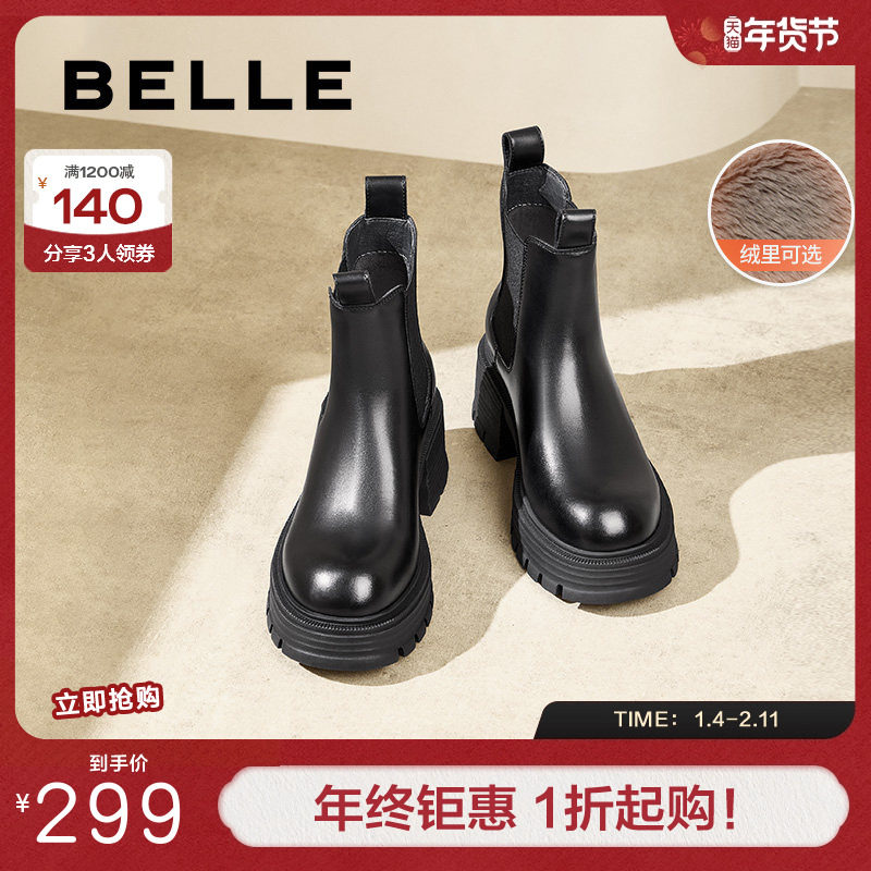 百丽厚底切尔西靴女冬新时装靴加绒瘦瘦弹力靴烟筒短靴B9J1DDD4