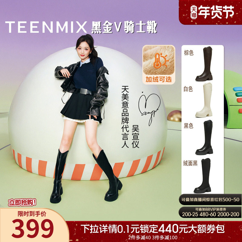 吴宣仪天美意厚底增高黑金V骑士靴加绒长靴女冬新款弹力靴时装靴