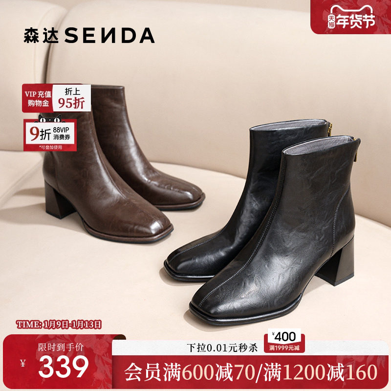 森达奶酪弹力靴高跟靴子25冬季新款热卖瘦瘦粗跟短靴女小个子气质