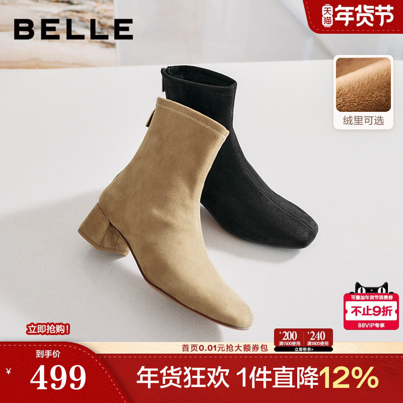 百丽画廊假日加绒时装弹力靴反绒面粗高跟显瘦瘦短靴子BBWB1DZ5