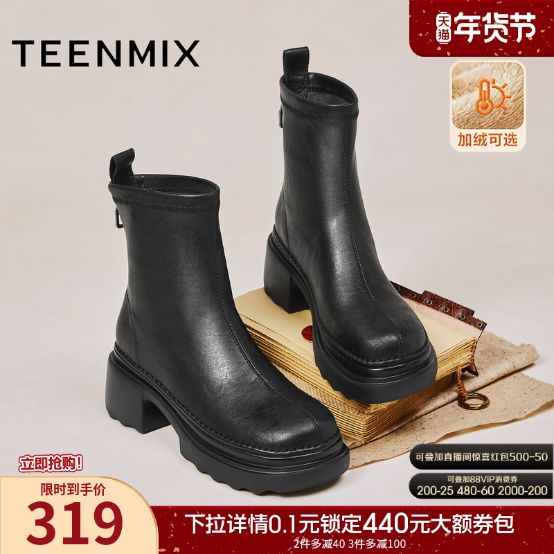 天美意复古英伦弹力靴乐福袜靴女厚底瘦瘦短靴冬新款COQ46DD4