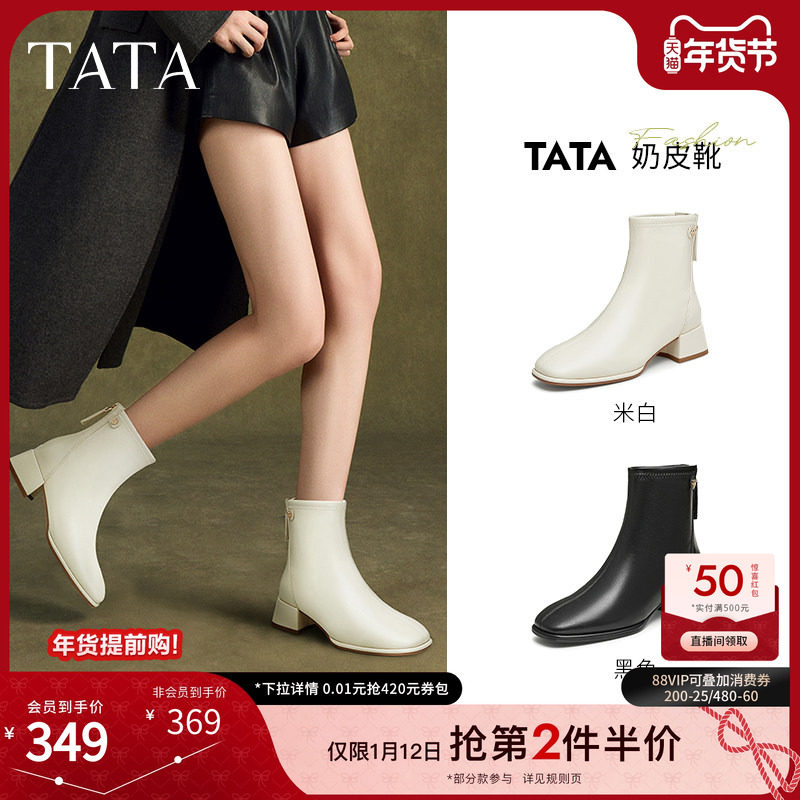 Tata他她靴子奶皮靴显瘦时装靴英伦短靴瘦瘦靴粗跟弹力靴WYX02DD4