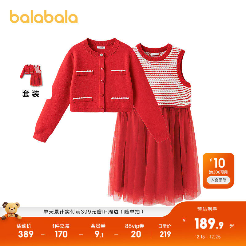 巴拉巴拉童装儿童连衣裙女童2025春装新款拜年服红色针织网纱裙子