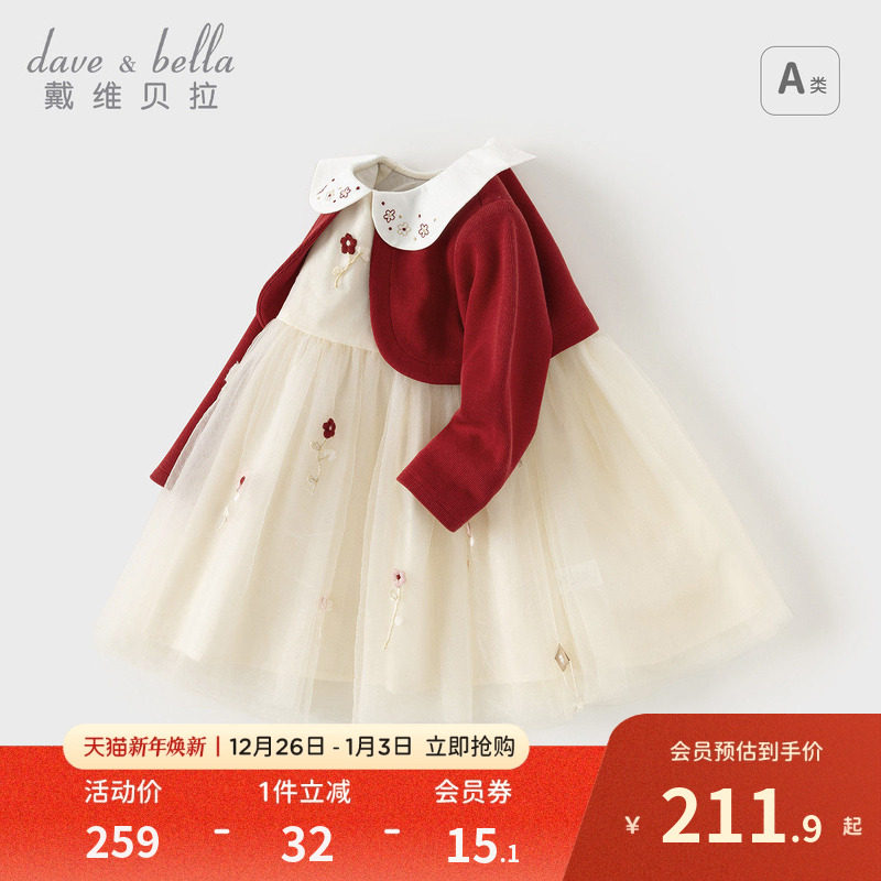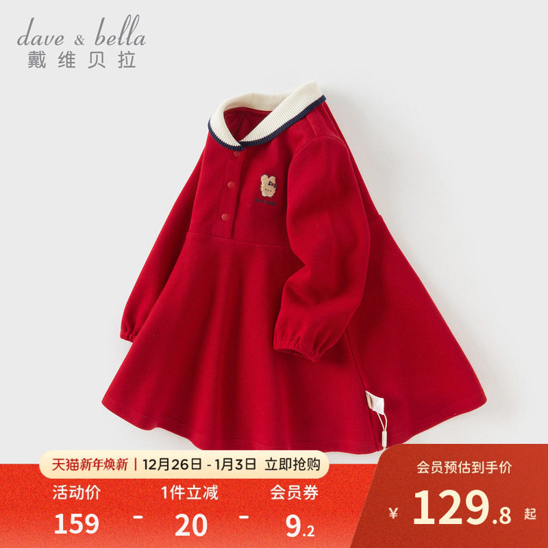 戴维贝拉女童连衣裙春装儿童新年红色公主裙周岁女宝礼服裙子洋气