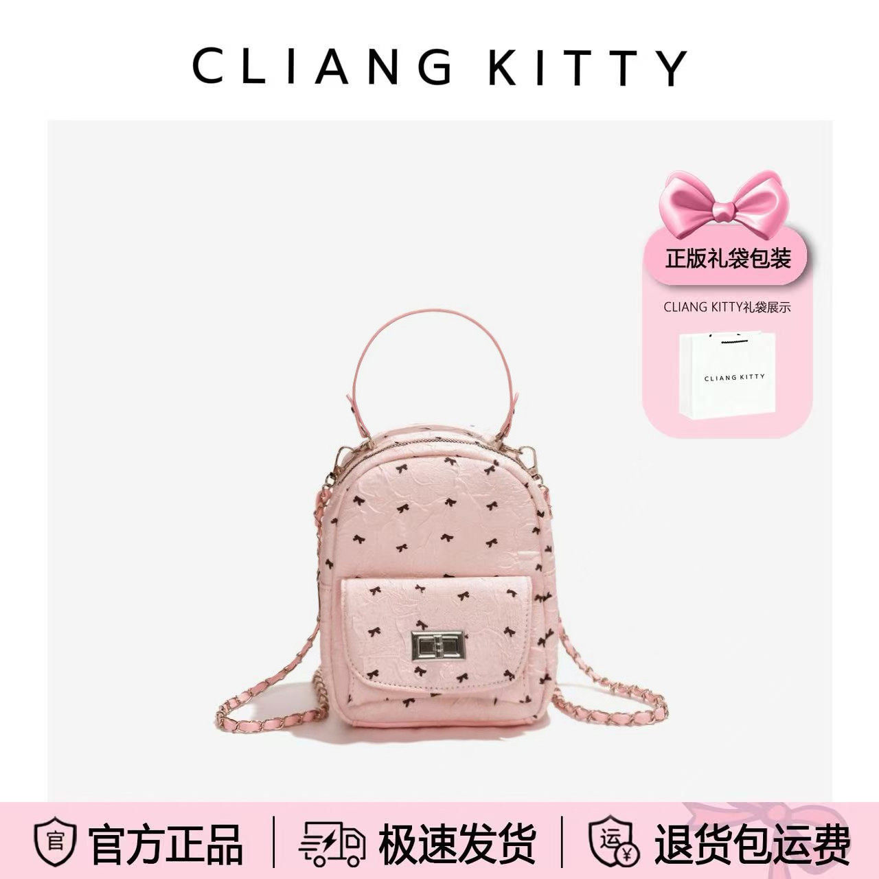 CLIANG KITTY粉色蝴蝶结印花链条双肩包女高颜值精致可爱小背包