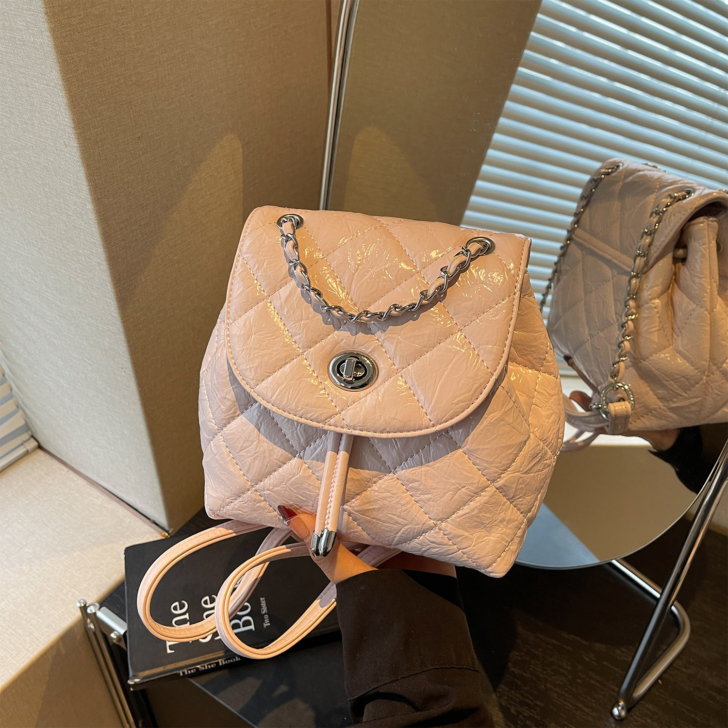 小众高级感菱格链条双肩包女2026新款韩系简约百搭通勤手提小背包