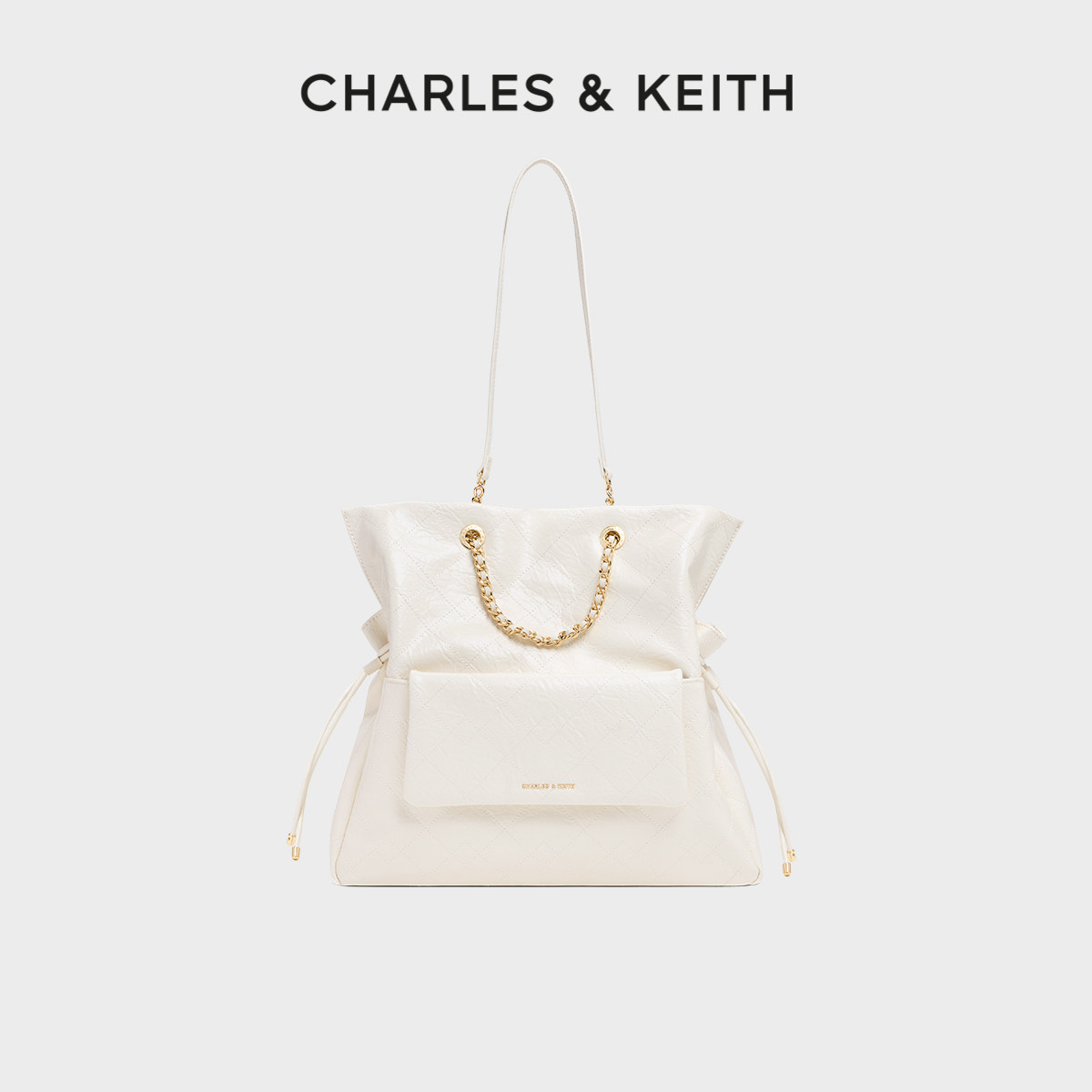 CHARLES&KEITH春季女包CK2-30782756抽绳油蜡皮菱格链条包双肩包