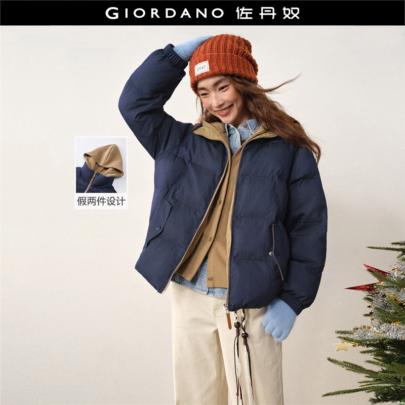 设计师款佐丹奴宽松棉服女装假两件撞色连帽牛仔棉衣外套18375519