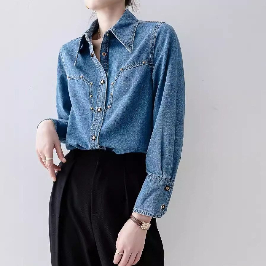 纯欲风复古牛仔衬衫女秋季新款高级感气质宽松显瘦polo领长袖外套