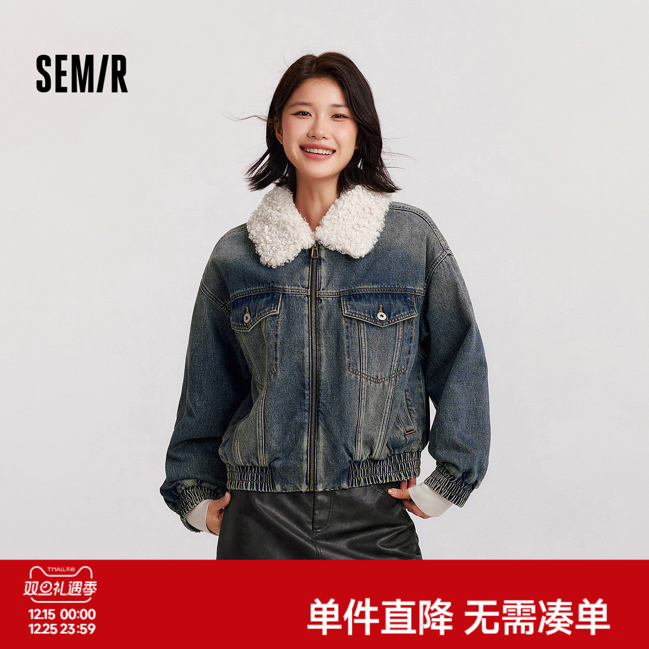 [商场同款]森马牛仔外套女拼接仿兔毛翻领宽松2025新款冬夹棉夹克