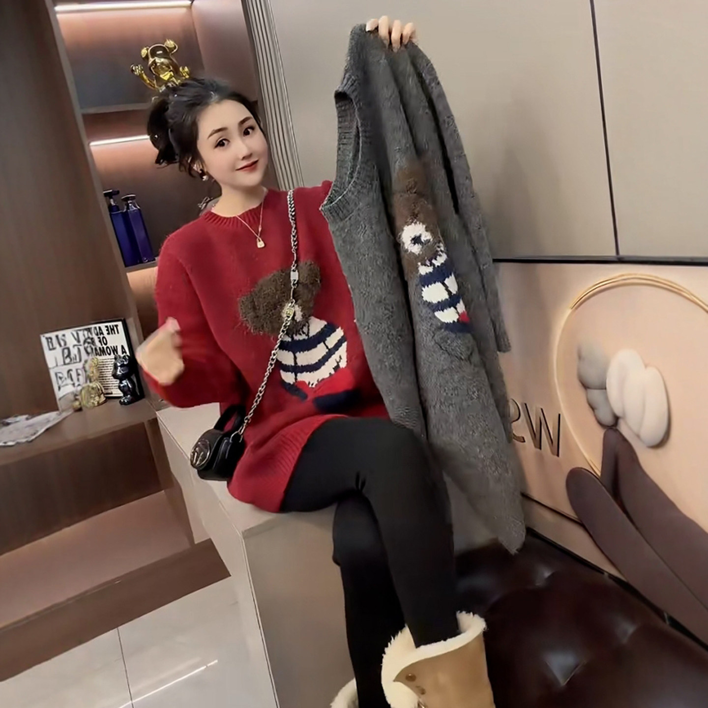 韩版卡通小熊刺绣圆领加厚针织衫女宽松百搭中长款慵懒风套头毛衣