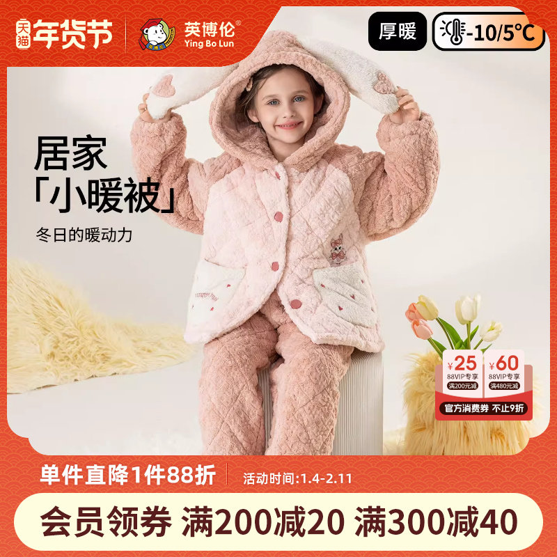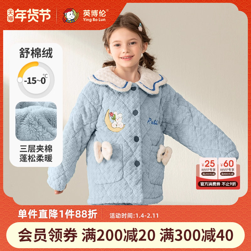 英博伦2024新款女童睡衣冬季加厚法兰绒儿童家居服三层夹棉珊瑚绒