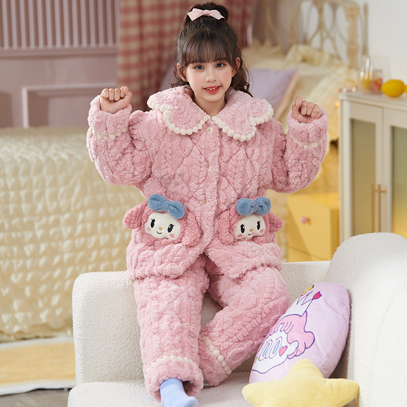 女童睡衣冬季加厚款法兰绒三层夹棉小孩套装宝宝中大童儿童家居服