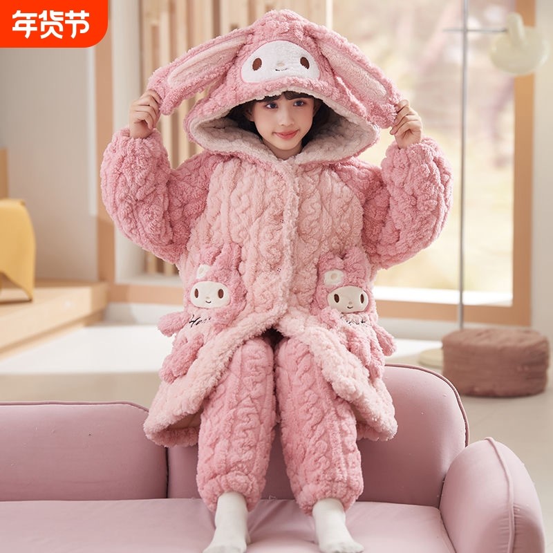 珊瑚绒三层夹棉卡通可爱风女童睡衣冬季加厚连帽家居服套装可外穿