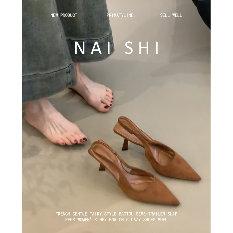 法式黑色气质名媛包头凉鞋仙女鞋子2025新款春夏季绒面尖头高跟鞋