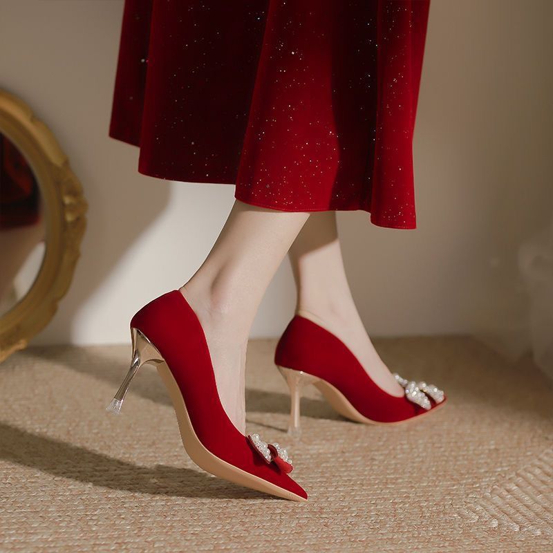 秀禾服婚鞋高级感敬酒服中式新娘鞋2023新款红色绒面尖头高跟鞋女