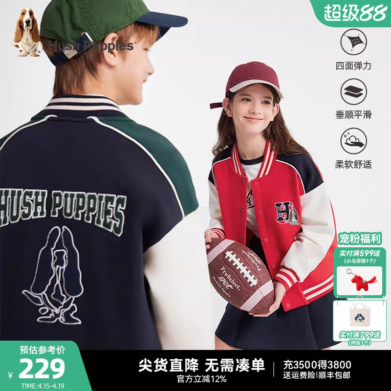 暇步士童装儿童棒球服大童春秋装新款男童女童学院风运动连帽外套