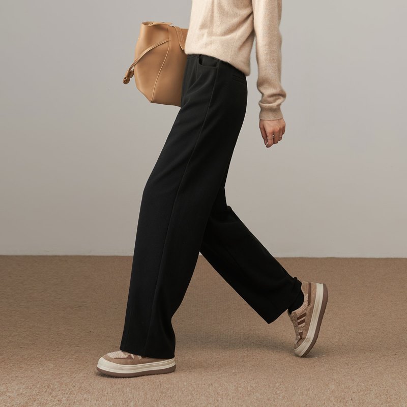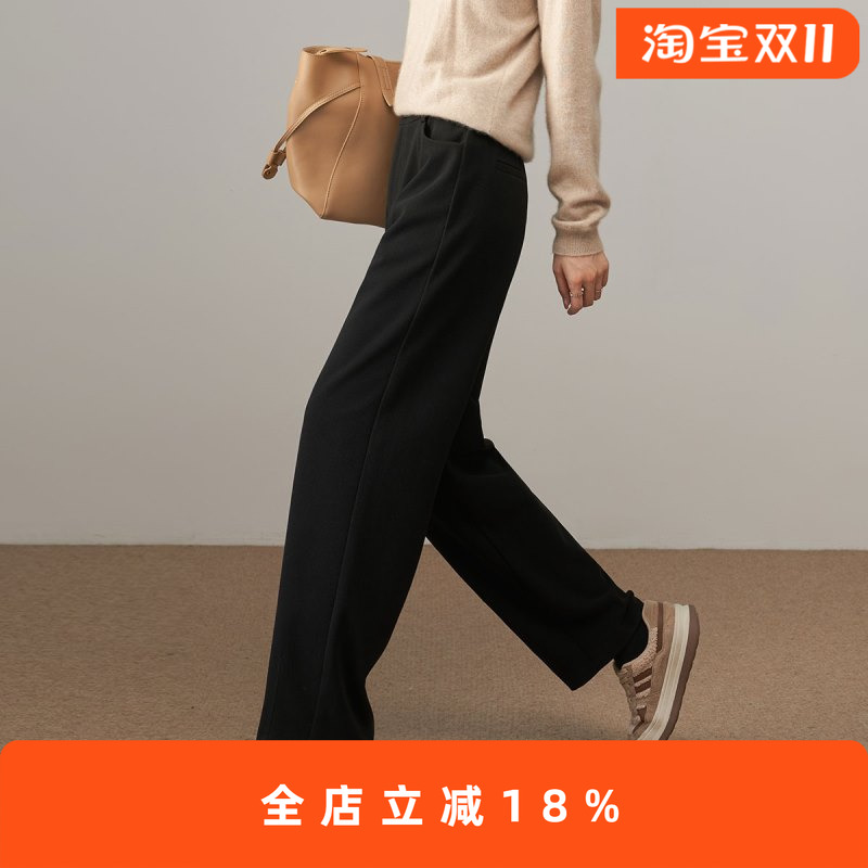 娅丽达宽松直筒哈伦裤女冬季仿毛呢裤子2025新款休闲裤黑色镰刀裤