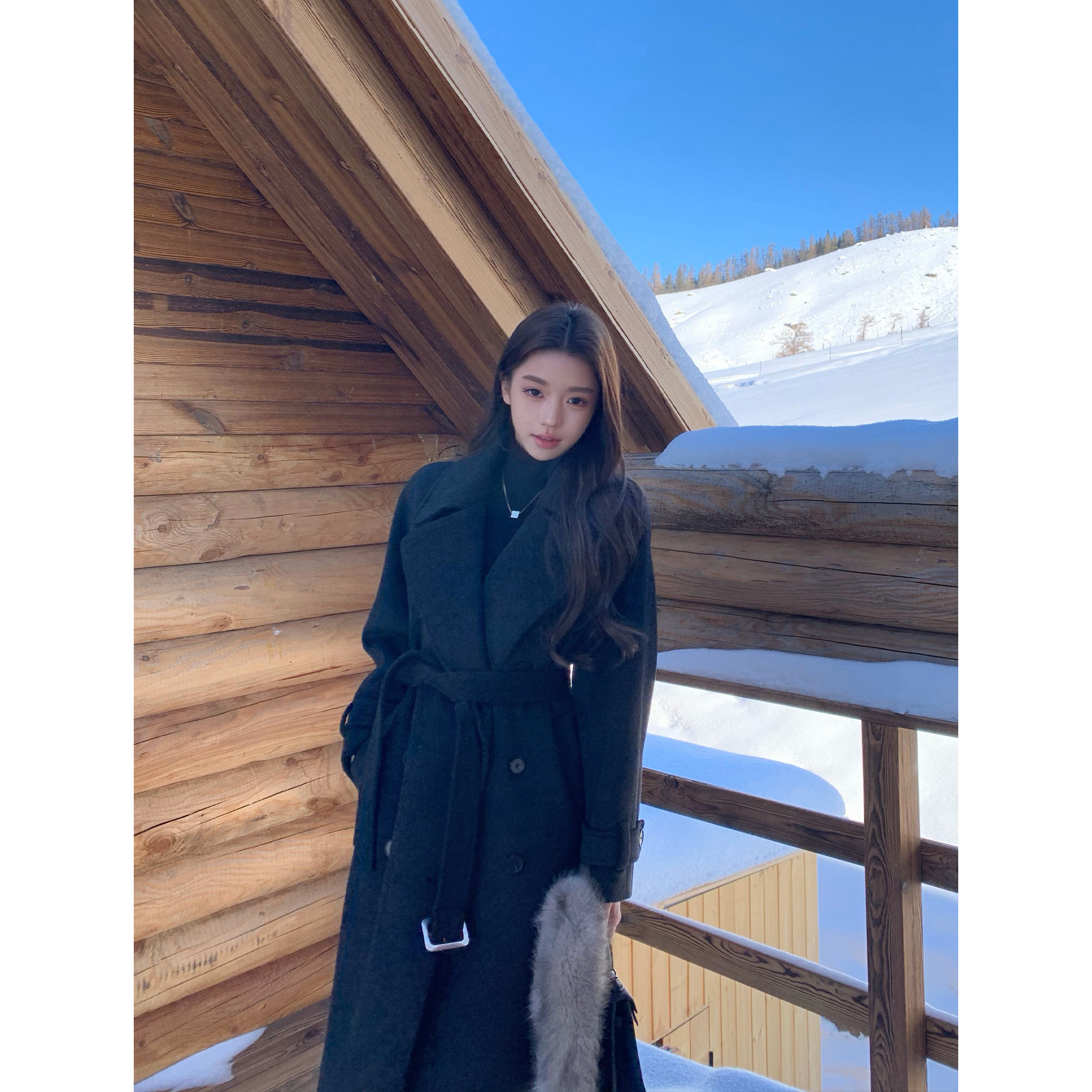 简漫黑金气质双面羊毛大衣女秋冬新款正肩腰带中长款过膝毛呢外套