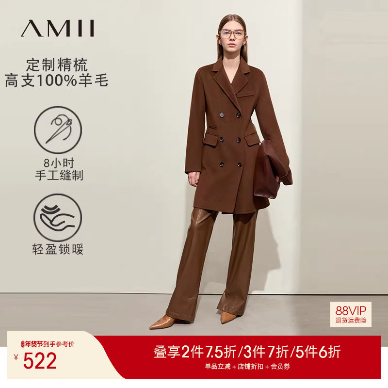 Amii极简西装毛呢外套女2025冬新款中长款大衣全羊毛配腰带双面呢