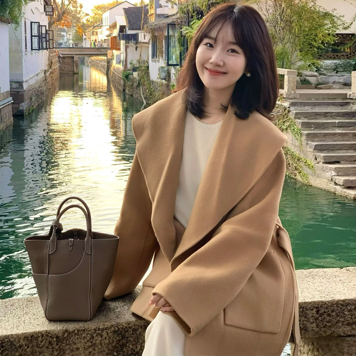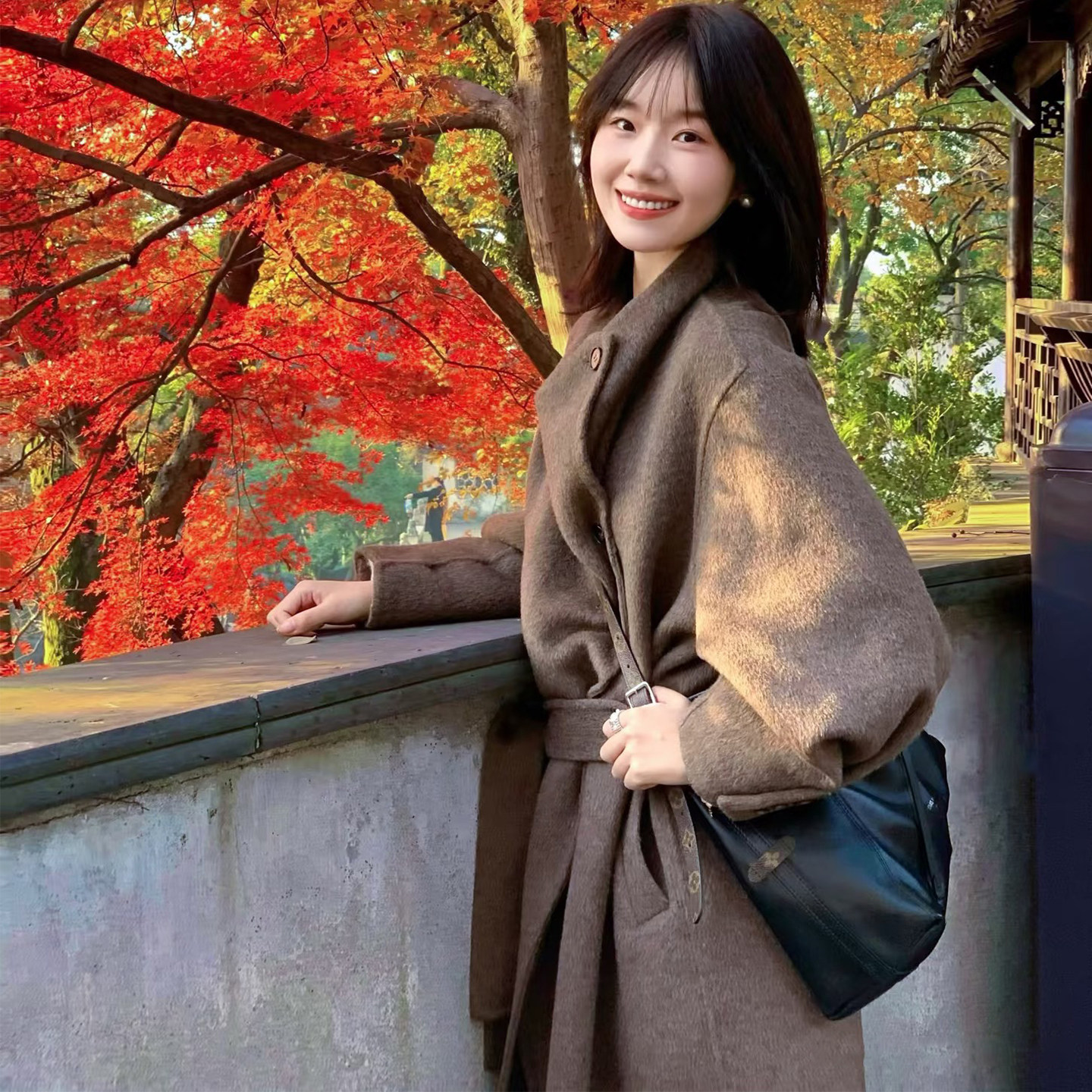 极简风大翻领毛呢外套女秋冬小个子中长款驼色腰带呢子大衣高级感