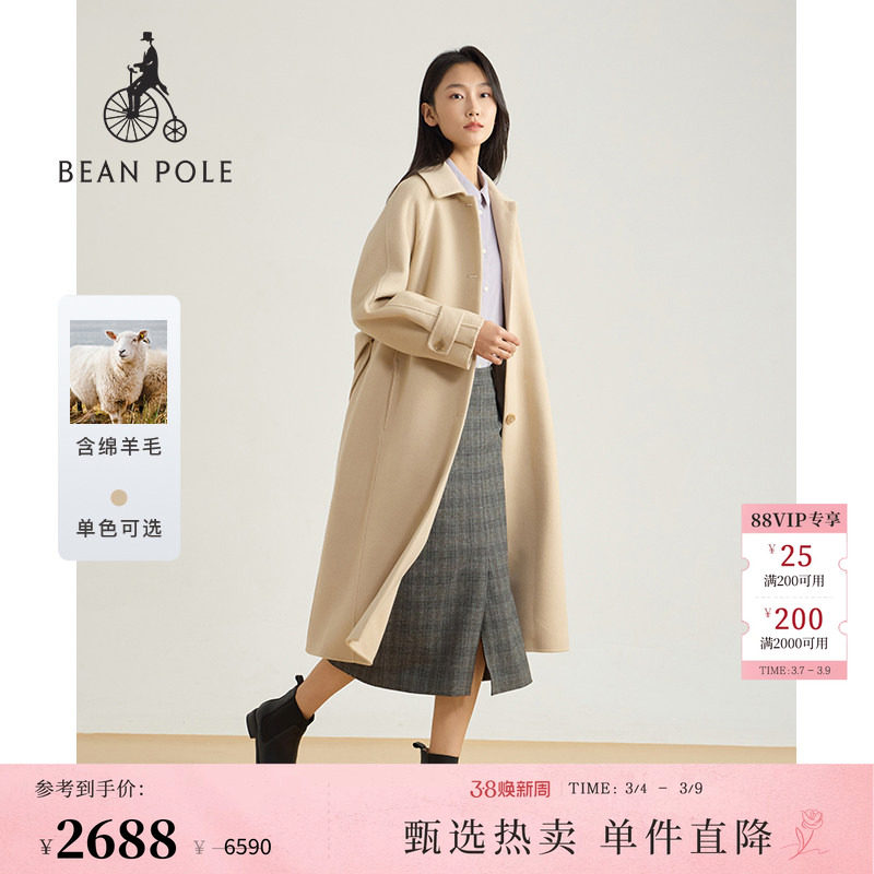 含绵羊毛 BEANPOLE滨波 女士商务休闲文艺腰带中长款毛呢大衣外套