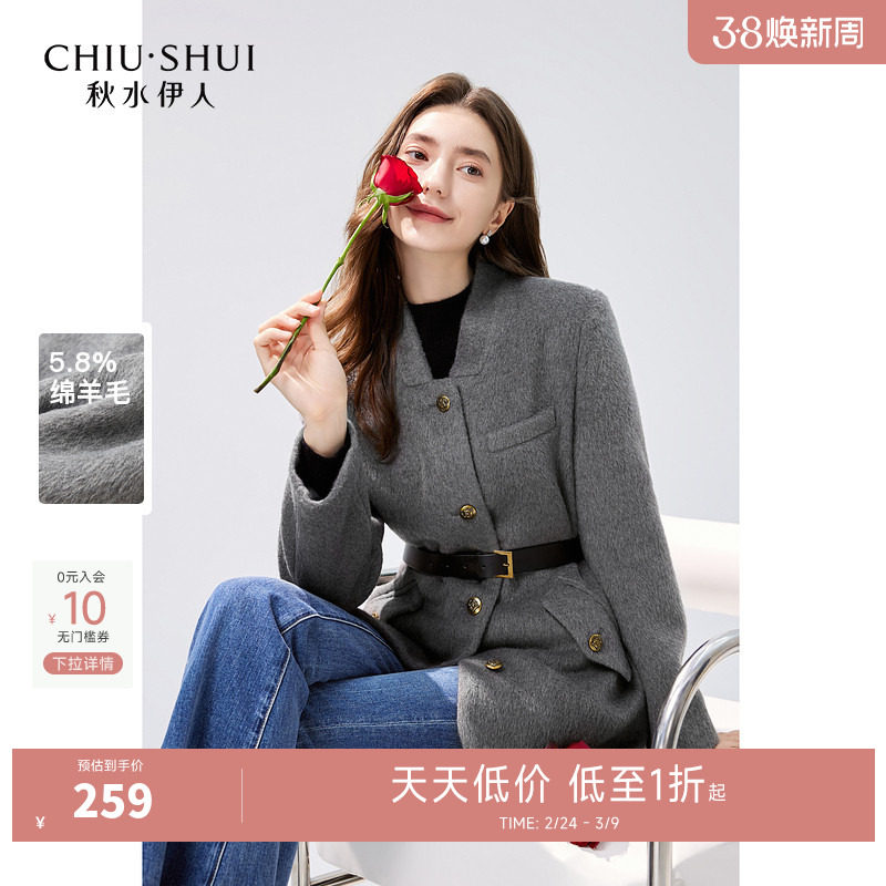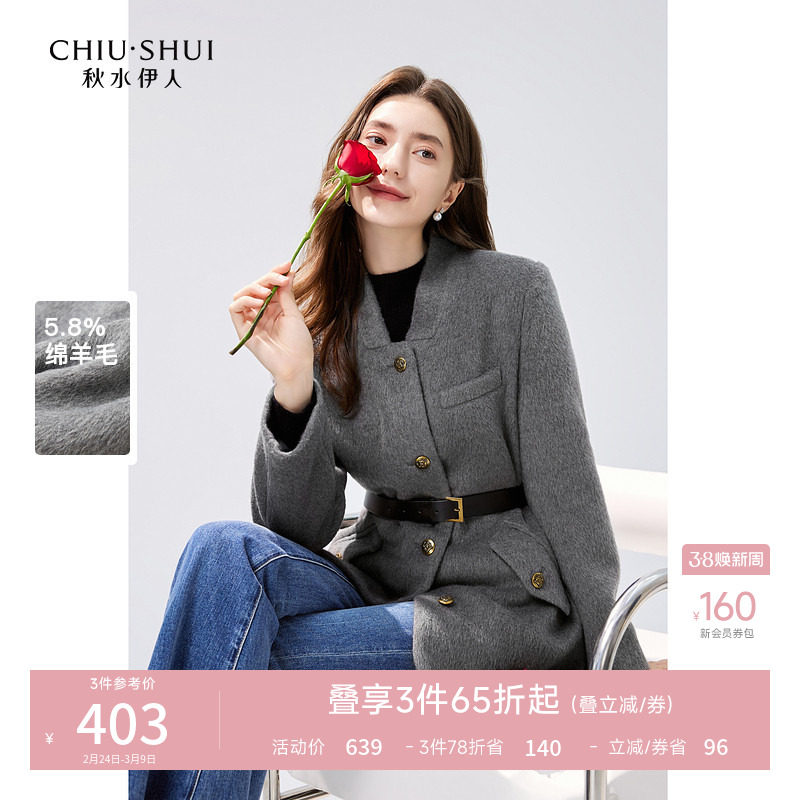 秋水伊人高级感气质V领毛呢外套2025冬新款女搭配腰带中长款大衣