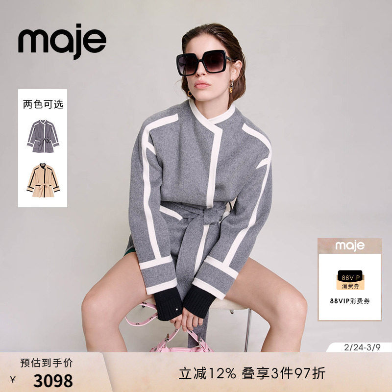 线上限定Maje秋冬女装法式时尚绵羊毛灰色腰带款中长款毛呢外套